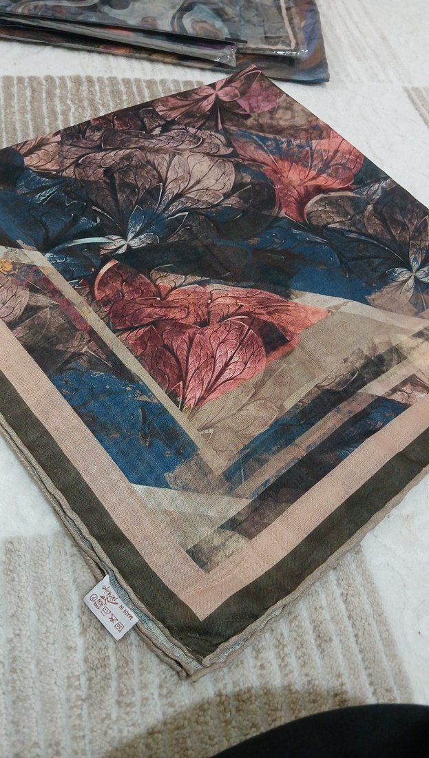 Bohem tarzında, yaprak desenli koyu kahverengi kadın şalı, yumuşak soft kumaştan ve drapeli tasarıma sahip.