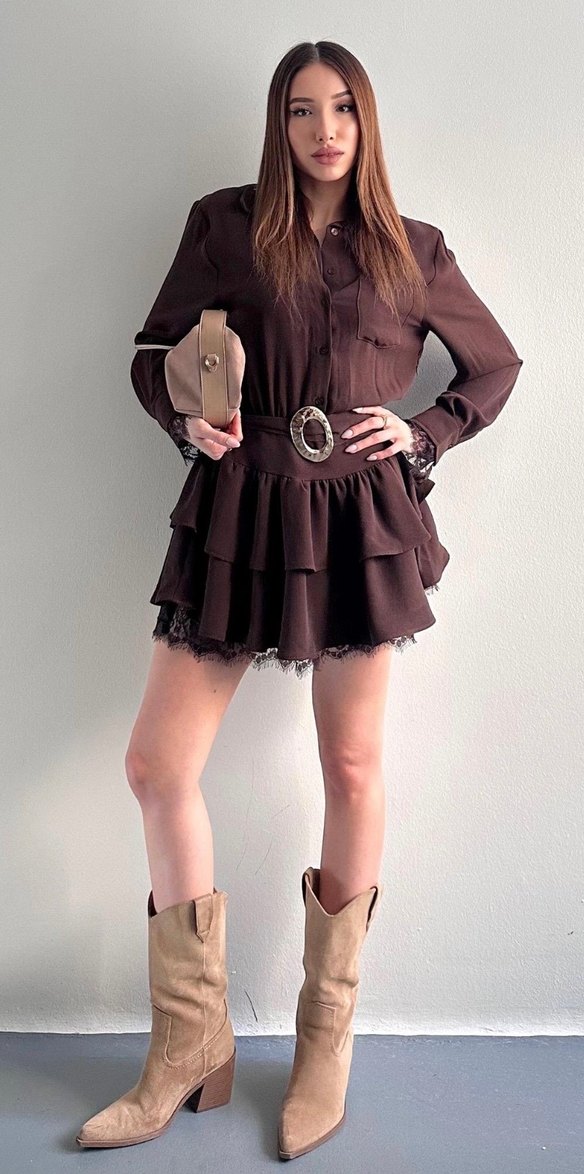 Bohem Tarzı Kahverengi Mini Deri Elbise