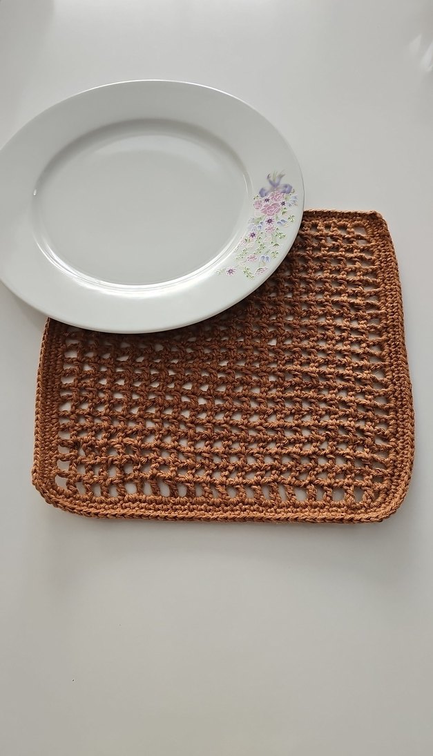 Bohem tarzı kahverengi örgü Amerikan servis, sade gri tabakla uyumlu. Masanıza doğal bir hava katıyor. ️ El örgüsü kare supla adet fiyatıdır #supla #el örgüsü