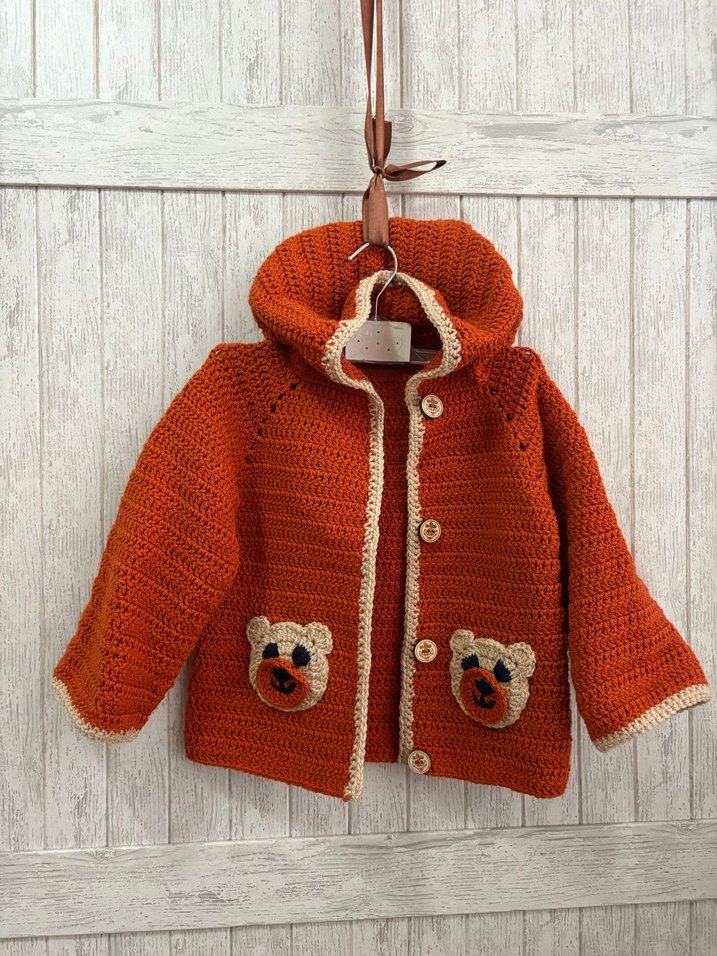 Bohem tarzı, uzun kollu, kahverengi örgü erkek çocuk hırkası, ceplerinde renkli nakışlı ayı detayları ve düğmeli kapama ile rahat bir kesime sahiptir.
