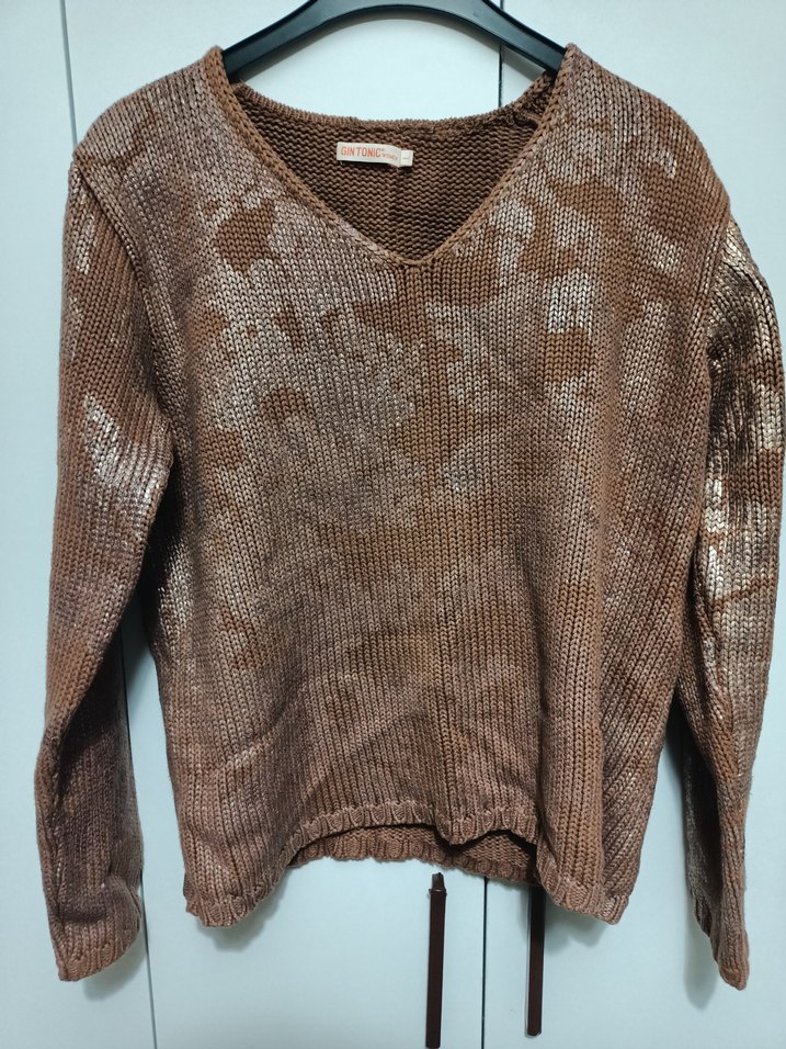 Kahverengi örgü kadın kazak, bohem tarzda, uzun kollu ve yuvarlak yaka. Rahat kesimi ve normal boyu ile günlük kullanıma uygundur.