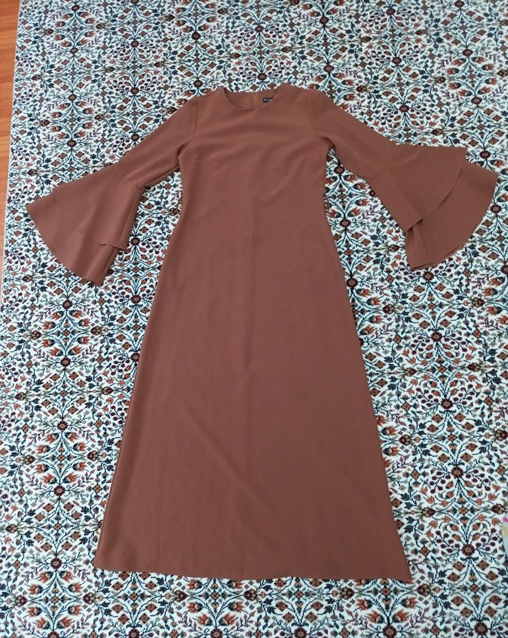 Bohem tarzda, kiremit rengi, uzun, bol kesim elbise. Uzun, drapeli kollar ve tekne yaka detaylarıyla renkli batik desenli, yumuşak sentetik kumaş.Bel kuşağı detaylı ve ceplidir. iç göstermez. 40 beden olup temiz kullanılmıştır. ürünün herhangi bir deformesi yoktur.