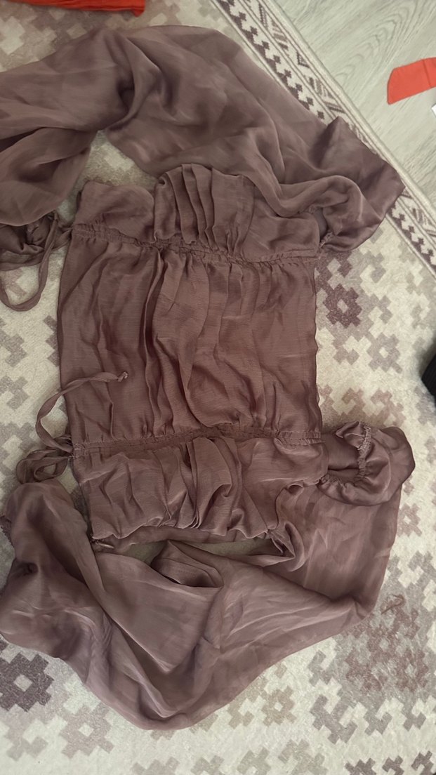 Yumuşak keten kumaştan, drapeli ve straplez tasarımlı, bohem tarzda, midi uzunlukta ve vücuda oturan bej bluz. Günlük kullanım için uygun.