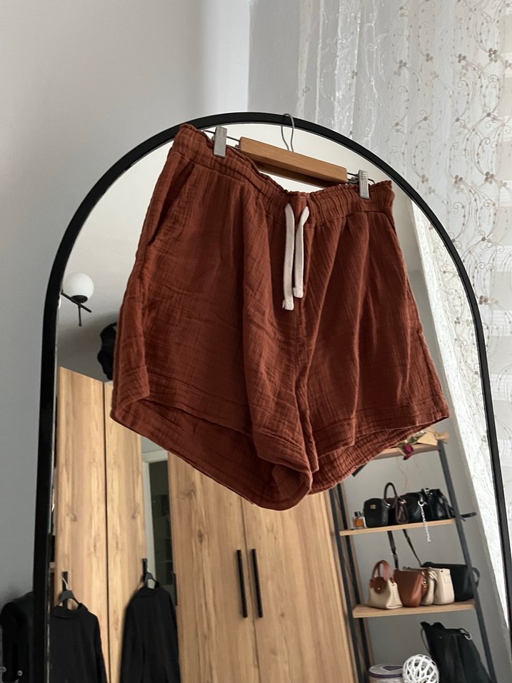 Bağcıklı bel detaylı, bol kesim kahverengi keten şort. Rahat ve bohem tarzıyla günlük kullanıma uygun.
