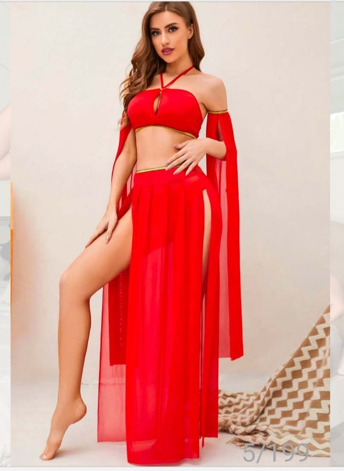 Cesur, dar kesim kadın elbise; askısız yaka, drapeli ve askılı kollarla. Uzun, desensiz kırmızı etek bohem tarzı ve parti için uygun. fantazi kostüm bedenler mevcut m l xl iade yoktur