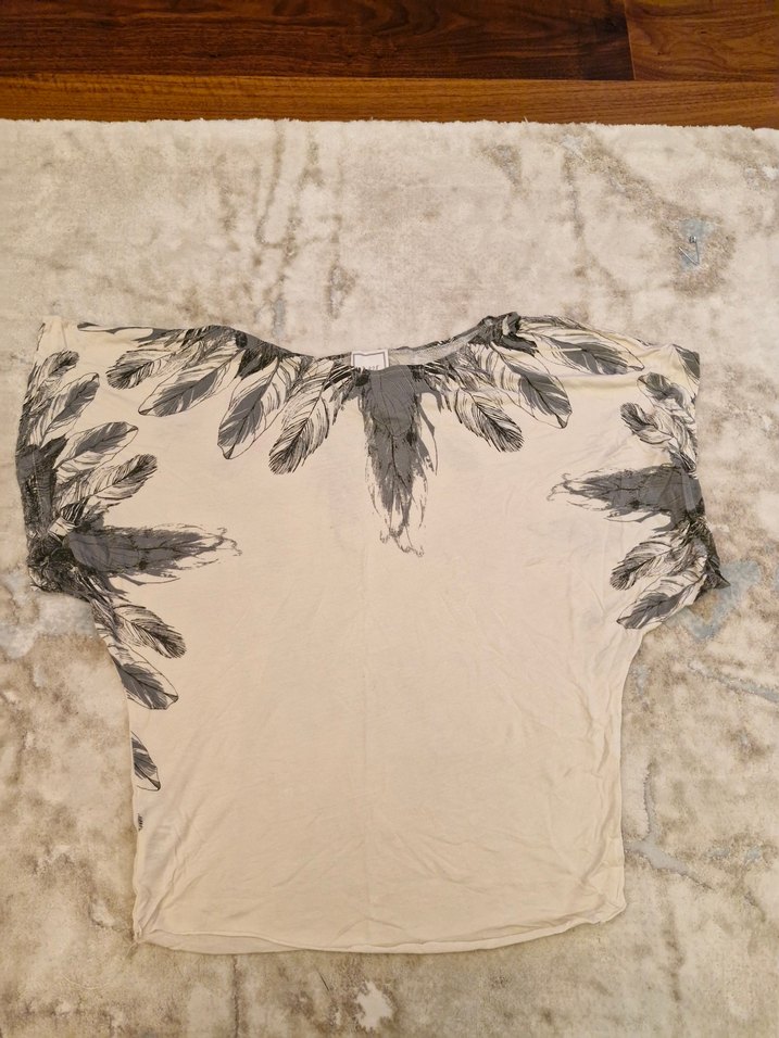 Gri tüy desenli, kısa kollu, bohem tarzda, gevşek kesim ve drapeli bej renkte kadın bluz.