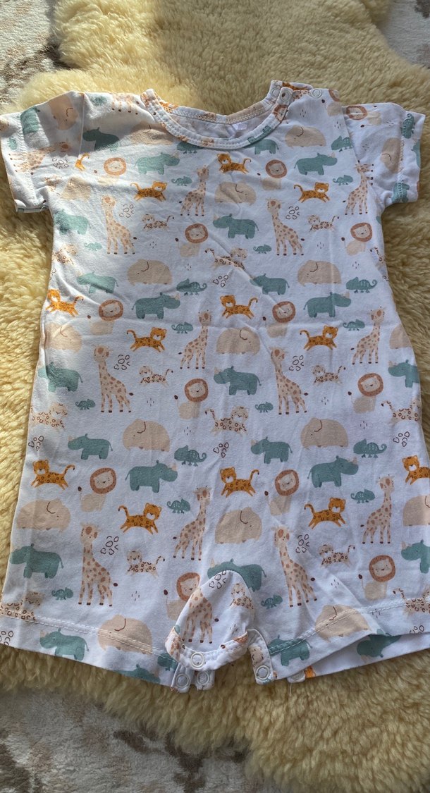 Kısa kollu, bisiklet yakalı erkek bebek tulumu, renkli hayvan desenli ve hafif sentetik kumaştan örülmüş, bohem tarzı bir üründür.