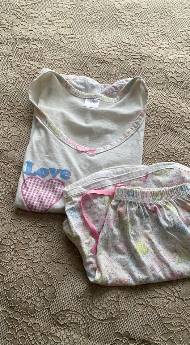Pastel beyaz, baskılı desenlere sahip, bol kesim kısa kollu kadın pijama takımı. Üstte 'Love' baskısı ve lastikli şort ile rahat bohem tarzı.