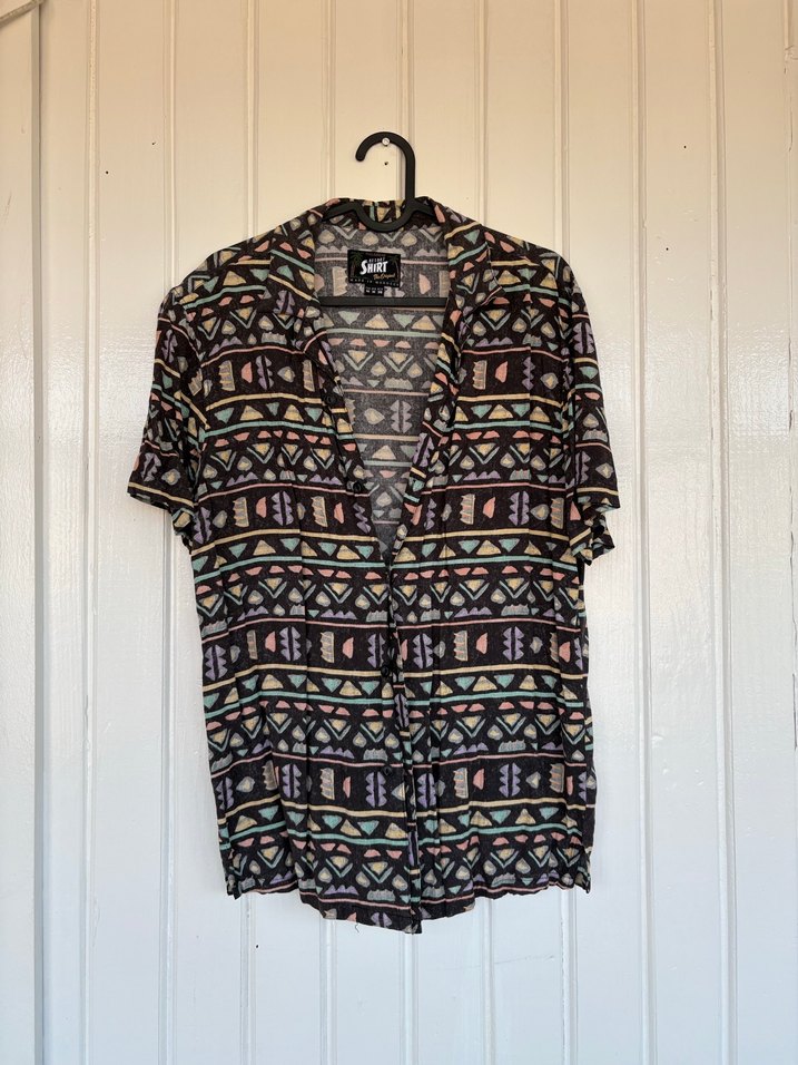 Bohem tarzı, kısa kollu, V yaka, düğmeli ve çok renkli desenli rahat kesim erkek gömleği.