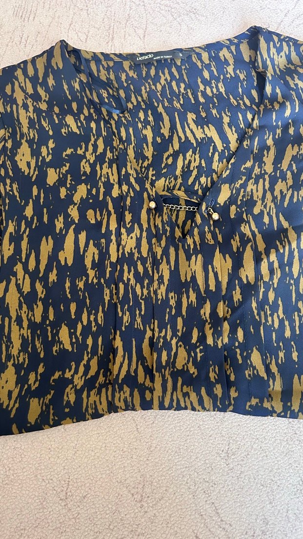 Kolsuz, drapeli kesime sahip, tekne yaka ve koyu bağlamalı desenli altın tonlarında mini bluz. Rahat ve kısa, dış mekan sokak stili için uygun.