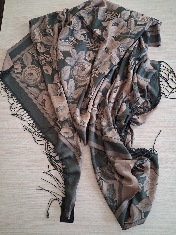 Bohem tarzı, ipeksi dokulu ve yeşil çiçek desenli, drapeli rahat bir şal. Retro ve hippie havası katan aksesuar.