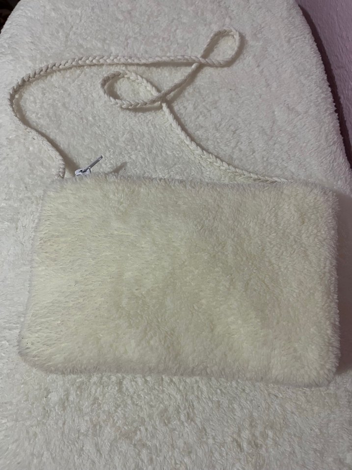 Yumuşak peluş krem dış yüzeye ve örgülü askıya sahip kadın çantası, günlük kullanıma uygun sade ve bohem tarzda. Sıfır ürün, hiç kullanılmadı .