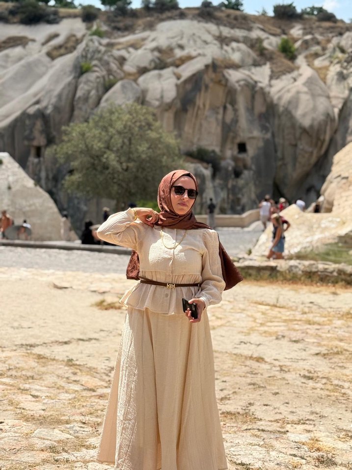 Yüksek yakalı, uzun kollu, bol kesim krem rengi keten elbise etnik desenli. Günlük kullanım için rahat ve şık bir seçenek. 1 kere Kapadokya da gıyıldı