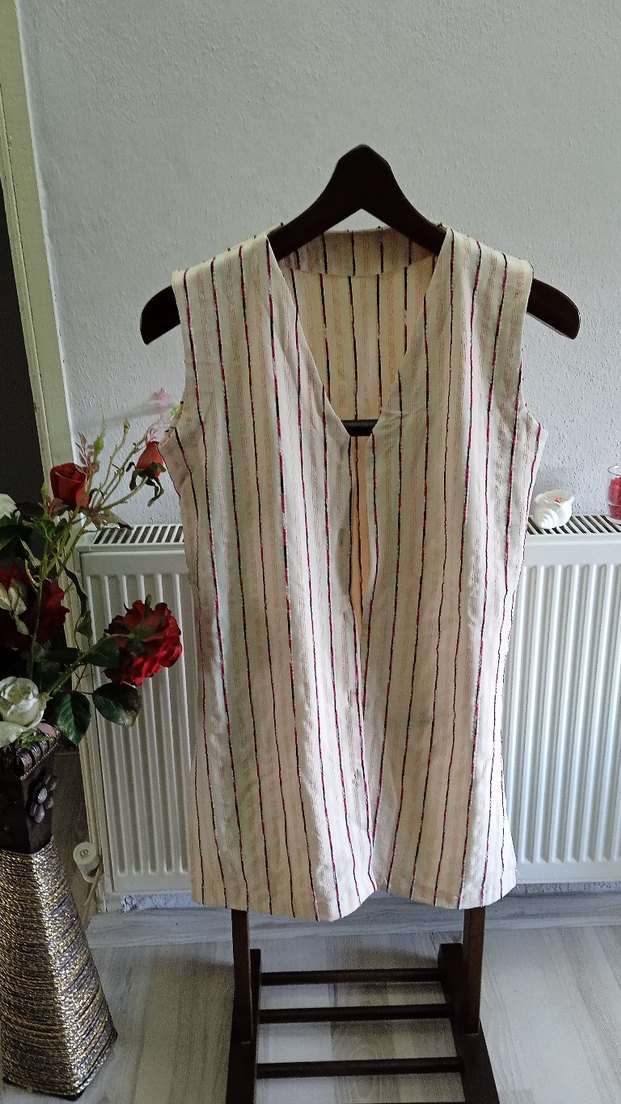 Bohem tarzı, askısız, drapeli Krem rengi YELEK. Dikey ince çizgiler ve rahat kesimle günlük kullanıma uygun.LİKRALI CEKET KUMAŞINDAN TERZİ DİKİMİDİR