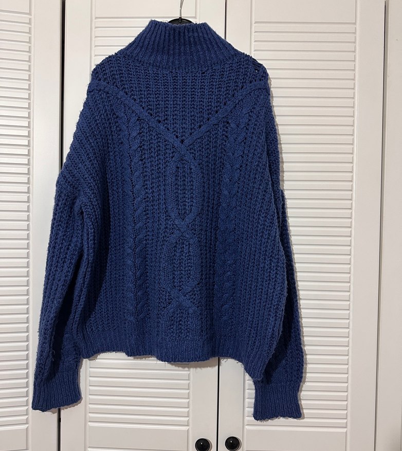 Boğazlı ve uzun kollu, bol kesim lacivert örgü kazak. Sade ve rahat tasarımı günlük kullanıma uygundur.