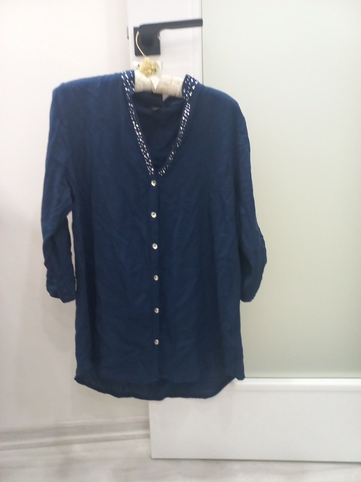 Lacivert, parlak keten kumaştan, düğmeli ve bohem tarzda, uzun kollu, yakalı, bol kesim kadın gömleği.