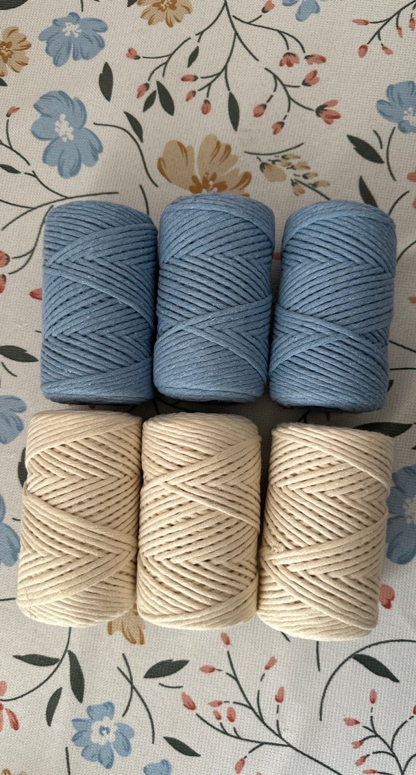 Bohem tarzı makrome ipi seti, üç mavi ve üç krem renkli ip içerir. El işi ve dekorasyon için uygundur. / Hepsi sıfır. Bir adet bobin 70 tl - Hepsini alırsanız 420 tl