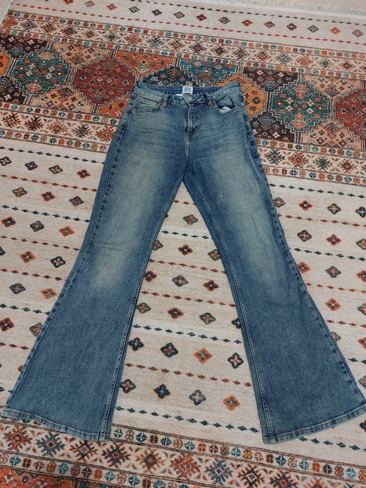 Bol kesim, midi boy mavi kot pantolon. Bohem tarzda, pastel batik desenli ve tokalı detaylara sahip, günlük kullanıma uygun.
