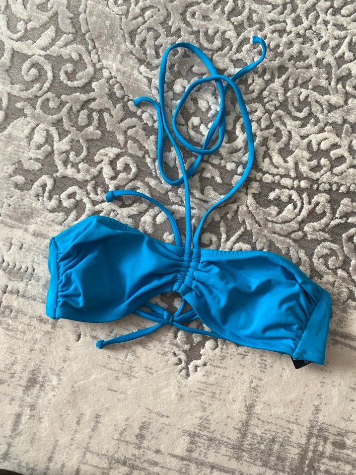 İpli, elastik detaylı, koyu tonlarda batik desenli mavi bikini üstü. Bohem tarzıyla plajda kullanıma uygun. H&M marka s beden.