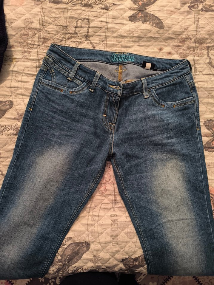 Bohem tarzı, tokalı, mavi kadın denim pantolon. Normal boyda, günlük kullanıma uygun, vücuda oturan model.