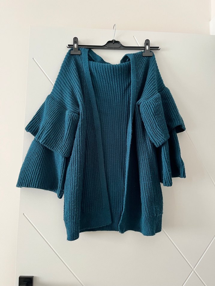 Mavi renkte, bohem tarzda, kısa ve bol kesim triko kadın hırka. Hafıf tüylenme var ama iyi durumda