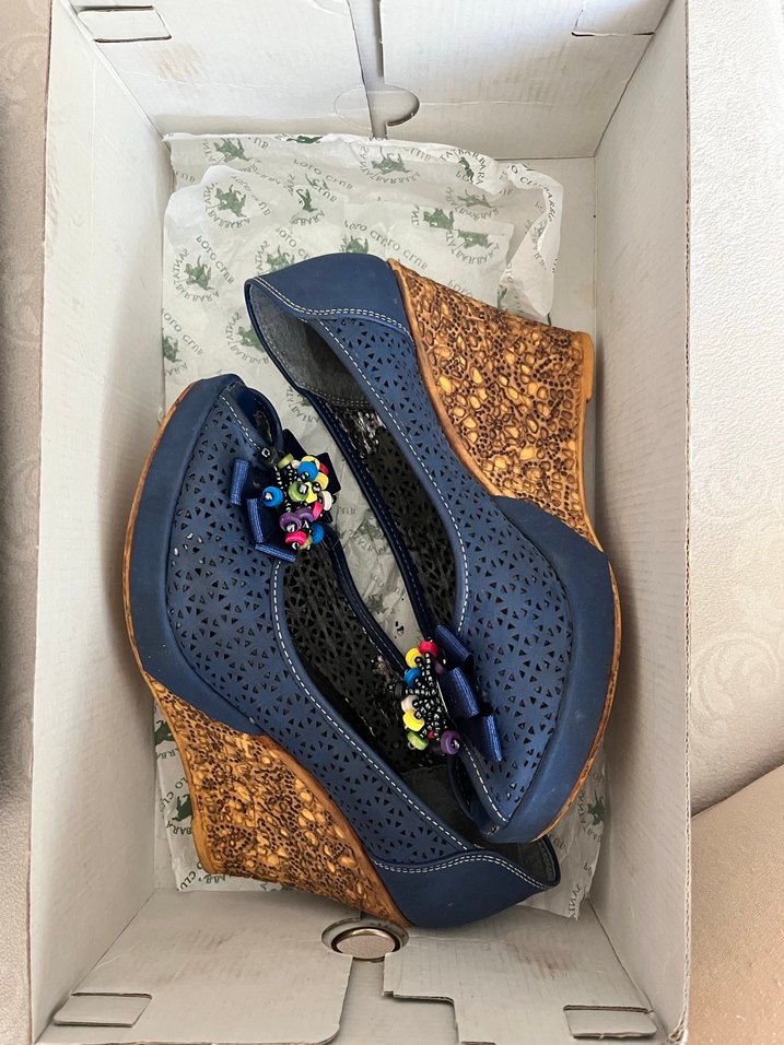 Mavi renkte, nakışlı ve tokalı detaylara sahip bohem tarzı dolgu topuklu ayakkabılar, rahat kauçuk tabanlıdır ve günlük kullanım için uygundur.