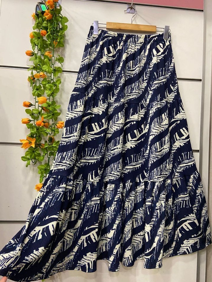 Uzun boy, piliseli ve bol kesim bohem tarzda, renkli mavi batik desenli sentetik kumaştan yapılmış etek.