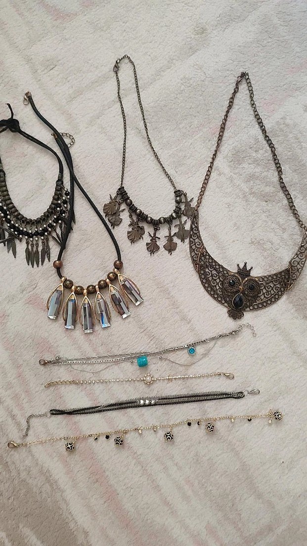 Kısa uzunlukta, boncuklu ve desenli tasarımlı koyu altın tonlarında bohem tarzı kadın kolyeleri, günlük kullanım için uygun.