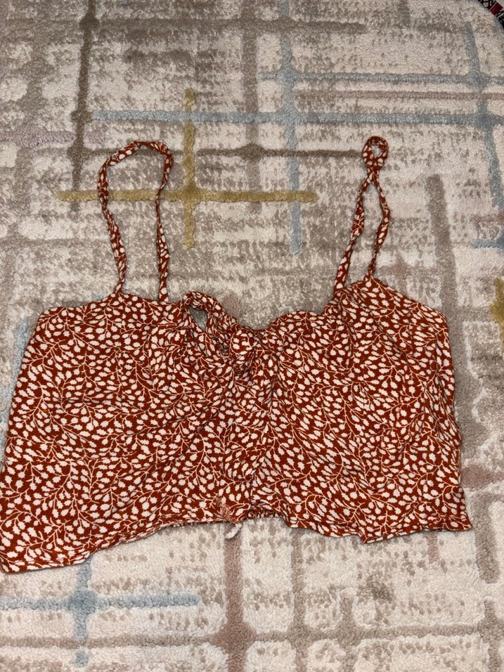 Bohem tarzda, kısa kesim, koyu kahverengi yaprak desenli ve ince ayarlanabilir askılı bralet.