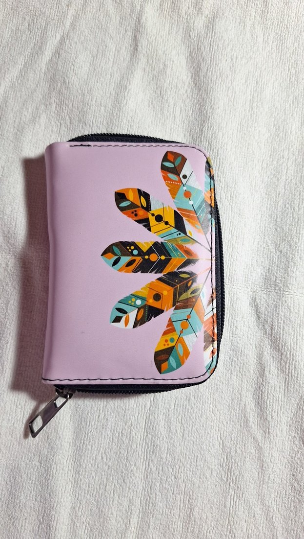 Mor renkli, baskılı tüy desenli sentetik kumaştan yapılmış, fermuarlı kapamalı bohem tarzı cüzdan.