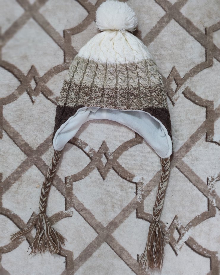 Nakışlı, bej ve gri tonlarında örme bere. Kulak kapaklı, örgülü püsküllü ve ponponlu detaylara sahip. ❄️