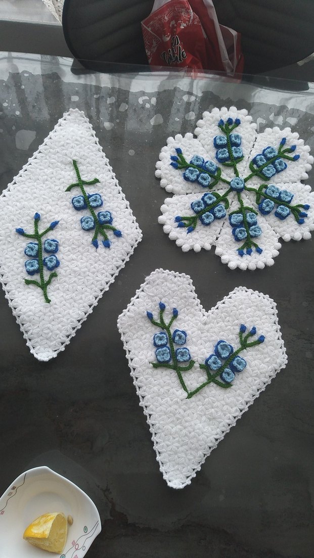 Mavi çiçek nakışlı, beyaz bohem tarzı el işi örtüler. Dekoratif kullanım için uygundur.