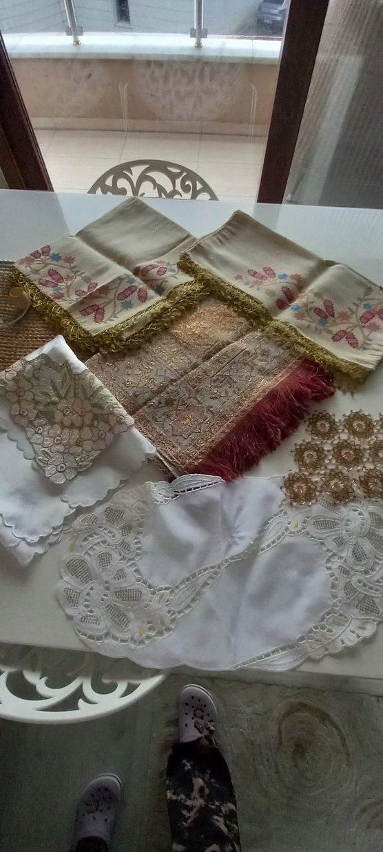 Bohem tarzda renkli nakışlar ve zarif dantel detayları içeren el işi tekstil seti. İnce desenler ve püsküllerle rustik bir hava katıyor. toplu fiyat 300.tepsi ortuleri,seccade,runner,şemantablo,bohça
