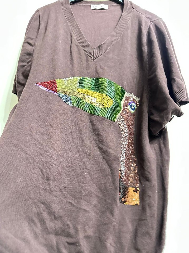 Kısa kollu, yuvarlak yakalı kahverengi hamile tişörtü, renkli nakışlı tukan figürü ile. Örgü dokusu günlük kullanım için rahatlık sağlar.