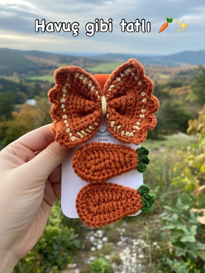 Nakışlı kahverengi fiyonk tokalı ve havuç şekilli renkli bohem tarzda saç tokası seti.
