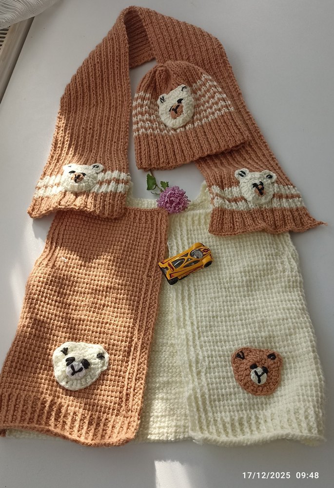 Bohem tarzda, kahverengi ve krem nakışlı ayı yüzlü örgü çocuk atkı ve bere seti. Yumuşak dokulu, pastel renklerde, retro görünümlü. kız ve erkek çoçuklar için uygun bebek çeyizi için özel parçalar yüzde yüz el emeği