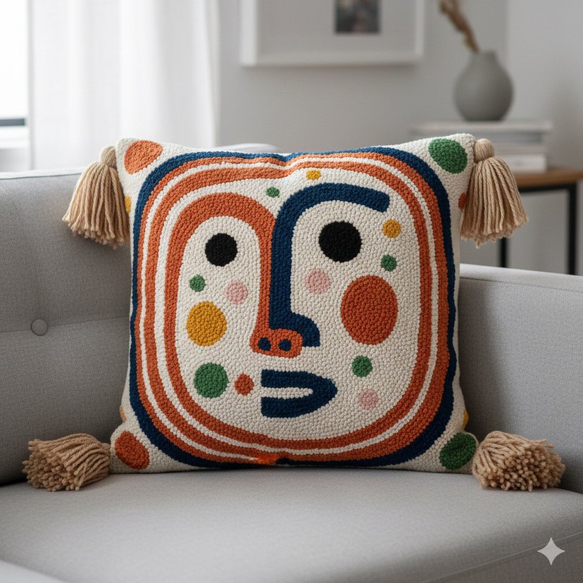 Bohem tarzı, nakışlı soyut yüz deseni ve köşelerde püsküller bulunan pastel renkli dekoratif yastık. Oturma alanlarına sanatsal bir dokunuş katar. ️