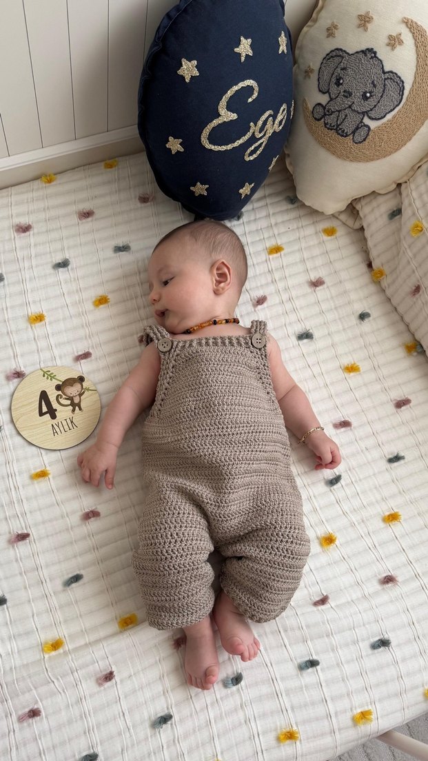 Bohem tarzı, kahverengi örgü askılı bebek tulumu. Halter yaka ve yumuşak örme kumaştan, istenilen ölçüde yapılabilir