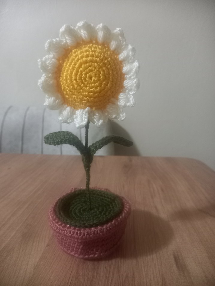 El yapımı bohem tarzı ayçiçeği, örgü yapraklar ve saksıda duruyor.
