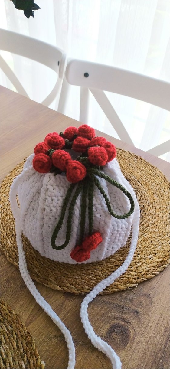 Kırmızı meyve süslemeli, yeşil iplerle bağlanan, yumuşak iplikten el yapımı bohem tarzı örgü çanta.