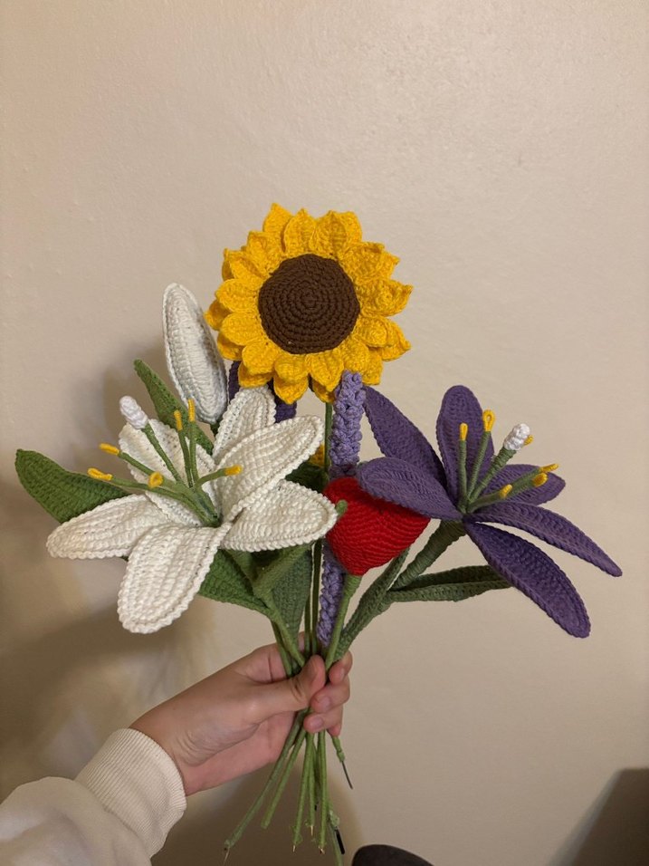 Günebakan, beyaz zambak, mor çiçek ve kırmızı lale içeren bohem tarzı el yapımı örgü çiçek buketi.