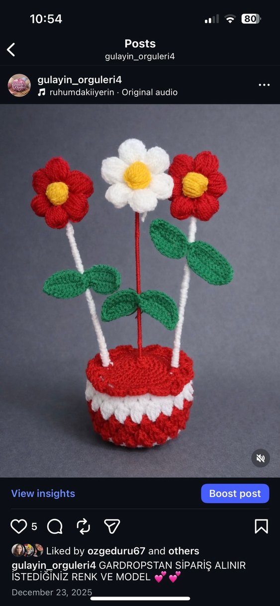 Kırmızı ve beyaz renklerde, yeşil yapraklı el yapımı bohem tarzı örgü çiçekler, örgü saksıda. El örgüsü istediğiniz renk yapılır