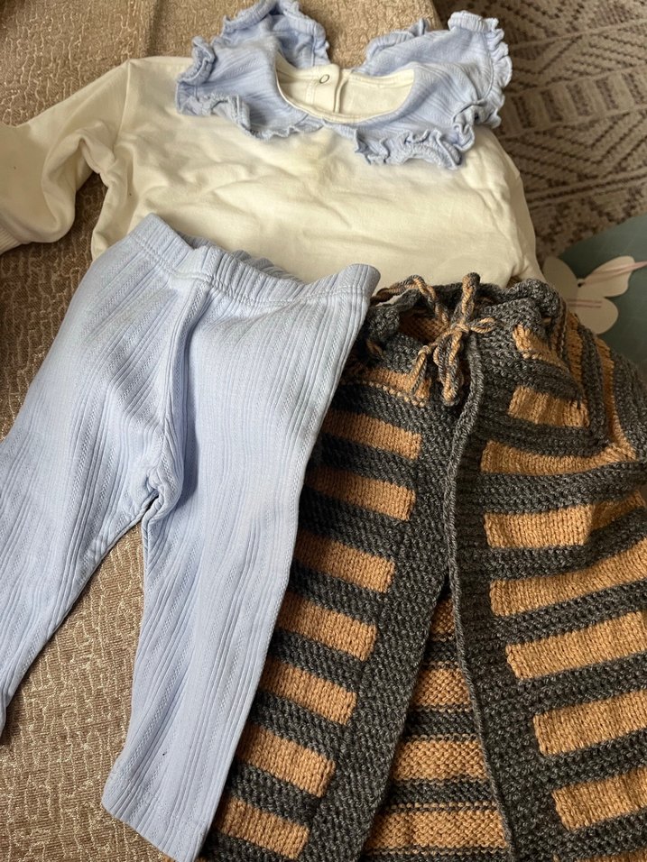 Uzun kollu krem bluz, mavi fitilli pantolon ve kahverengi-gri çizgili örgü yelekten oluşan bohem tarzı erkek bebek kıyafet seti. Yumuşak örme kumaş kullanılmıştır.