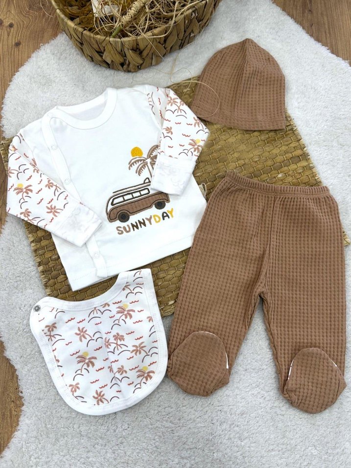 Kahverengi örgü uzun kollu üst, baskılı kollu, 'SUNNYDAY' yazılı, örgü pantolon, şapka ve baskılı önlükten oluşan bebek takımı. 5li takım set