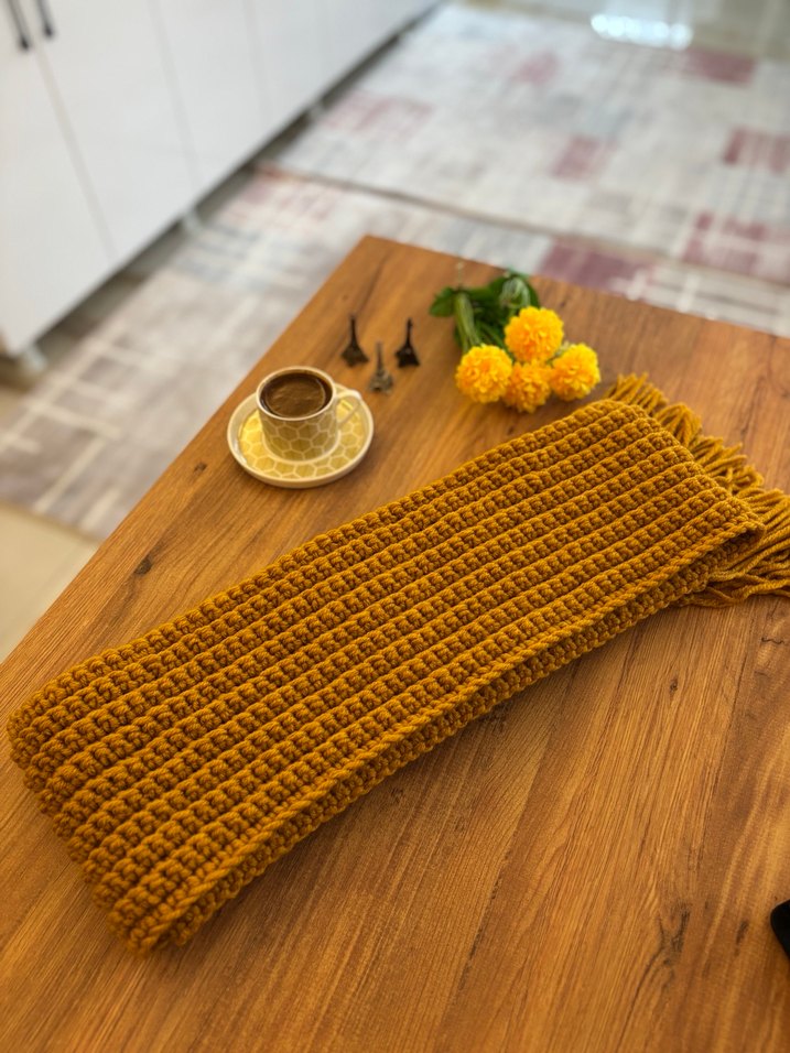 Koyu kahverengi, örgü dokulu, püsküllü kenarlarıyla bohem tarzı kadın şalı, retro ve hippie görünüme uygundur.