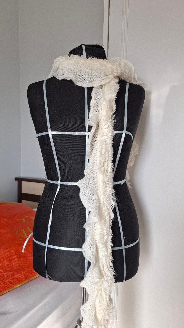 Krem tonlarda, bohem ve avant-garde tarzda örülmüş kadın atkısı.