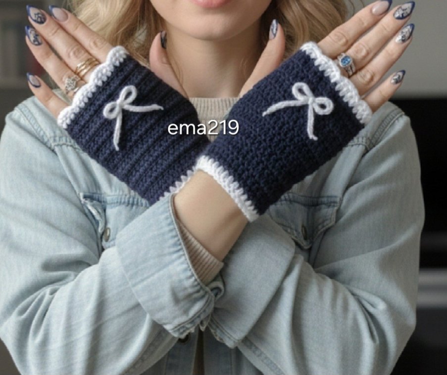 GÖRSEL BANA AİTTİR ✔️ İLAN AÇIYORUM Lacivert ve beyaz tonlarda örgü kadın eldivenleri, bohem tarzıyla rahat ve şık bir görünüm sunar.