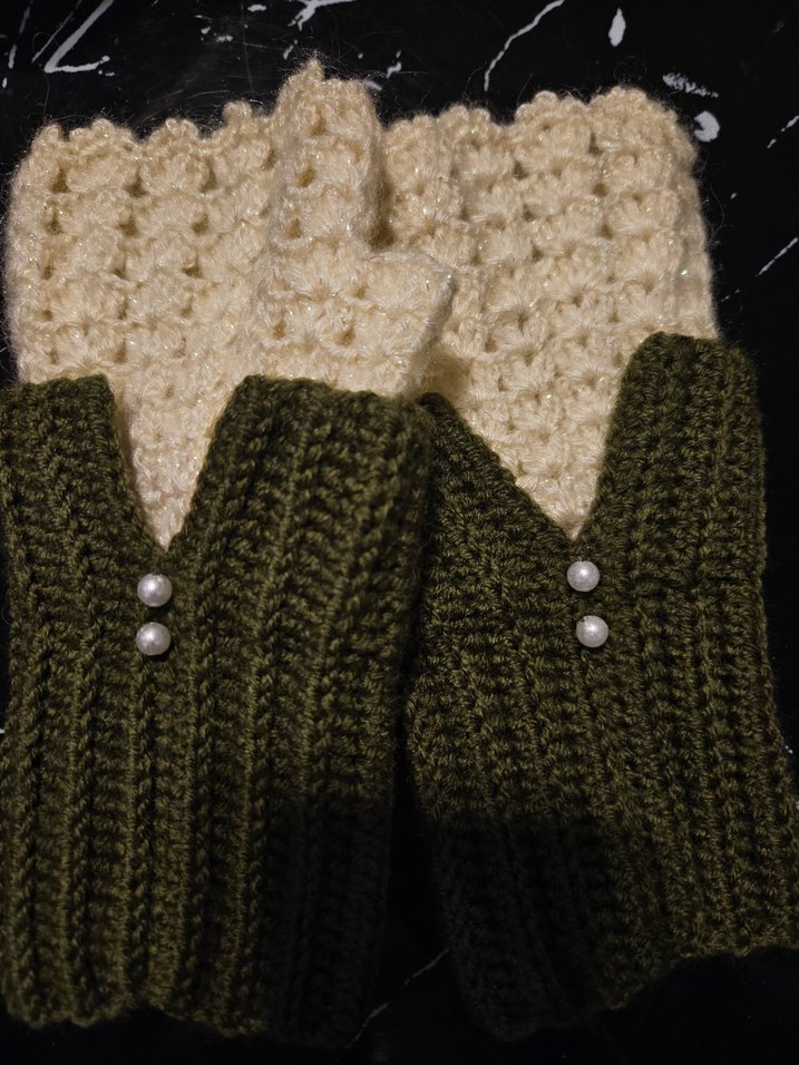 Bohem tarzı, örgü kadın eldivenleri, haki ve krem renklerde, küçük inci detaylarıyla sıcak bir görünüm sunar. El işi örgüdür.