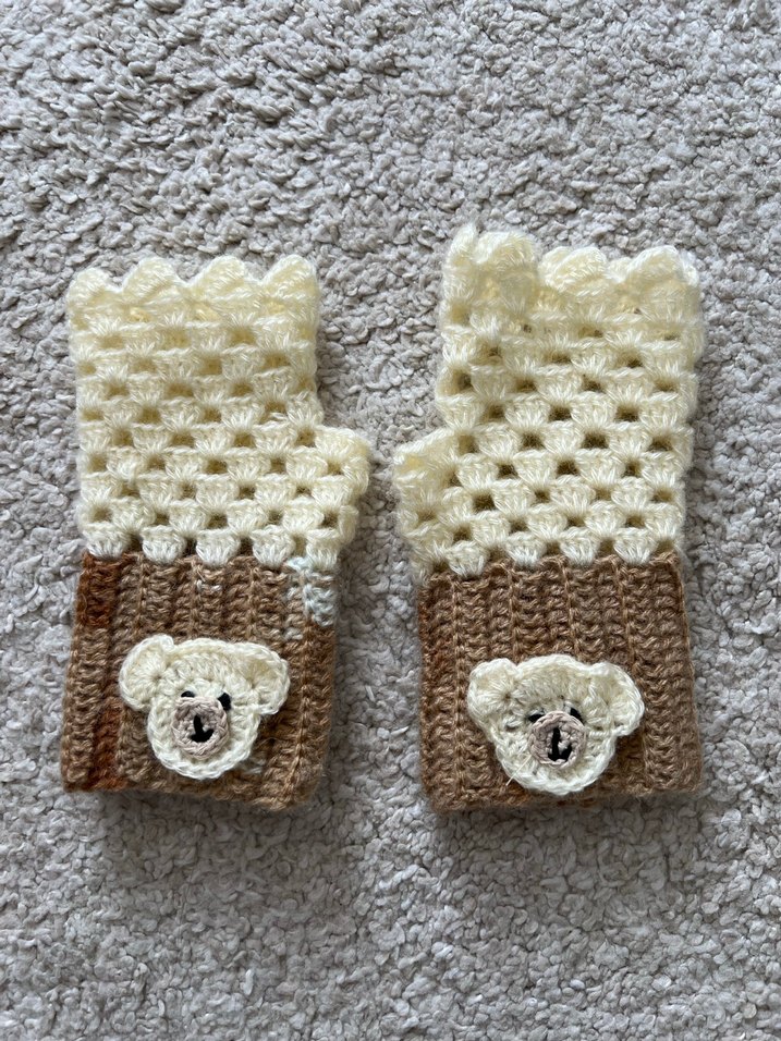 Bej renkte, örgü yapıda bohem tarzı kadın eldiveni, rahat ve pastel tonlarda, manşetlerinde ayıcık figürleri bulunuyor.
