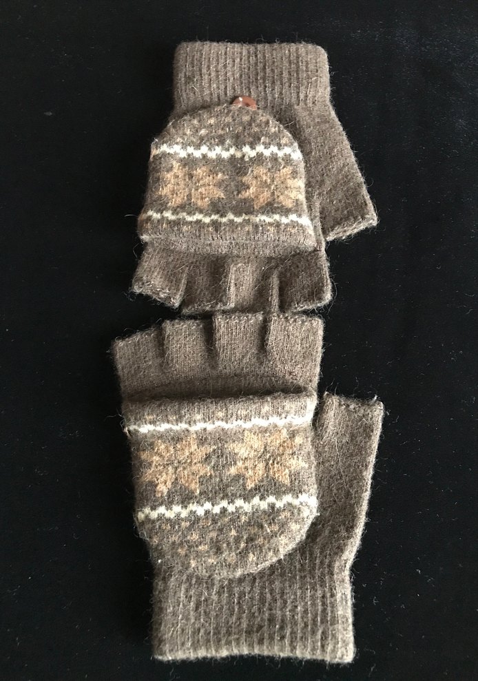 Bohem tarzı, kahverengi ve gri tonlarında örgü kadın eldiveni. Parmaksız olup, ekstra sıcaklık için kapaklıdır. Markasızdır
